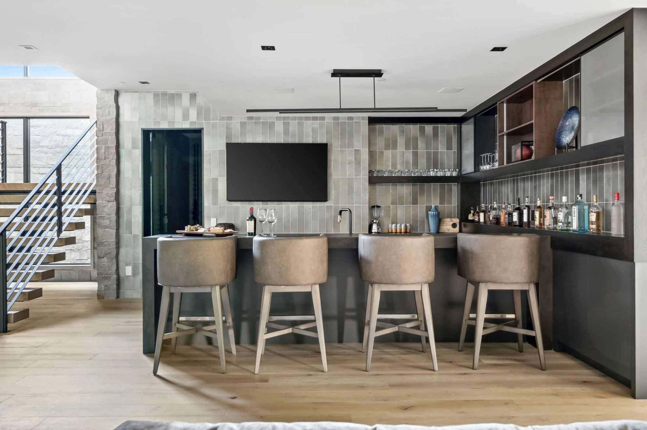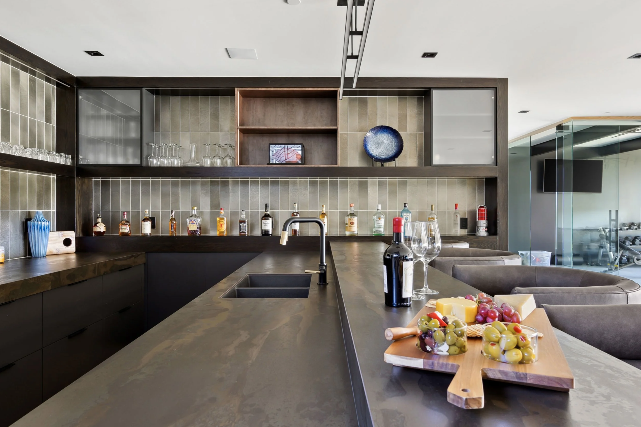 A modern mountain home featuring clean lines and organic textures. The home has a strong connection to indoor outdoor living, as well as unique discovery elements in each room. All cabinetry is through Coeur. Winner of NKBA Western Canada BEST Contemporary Large Kitchen