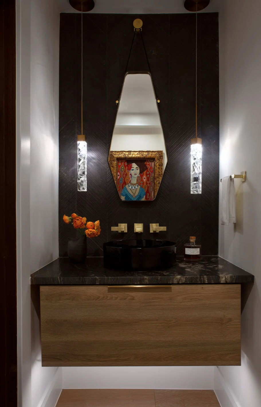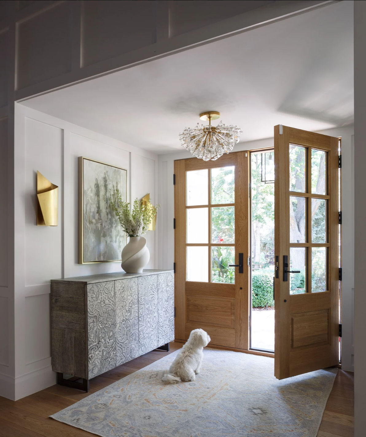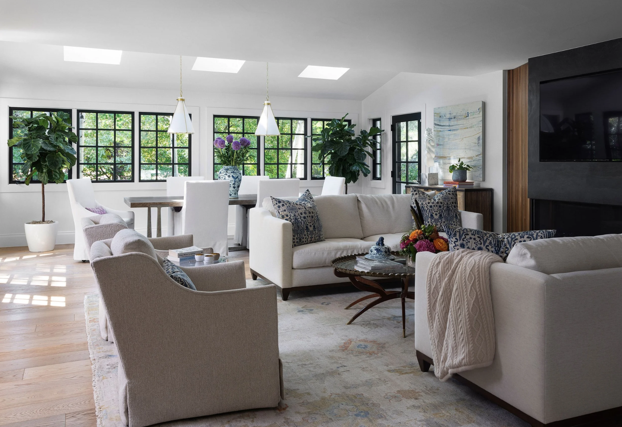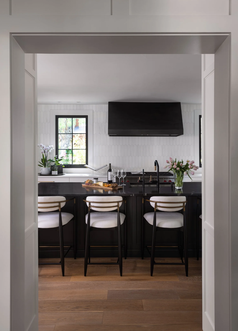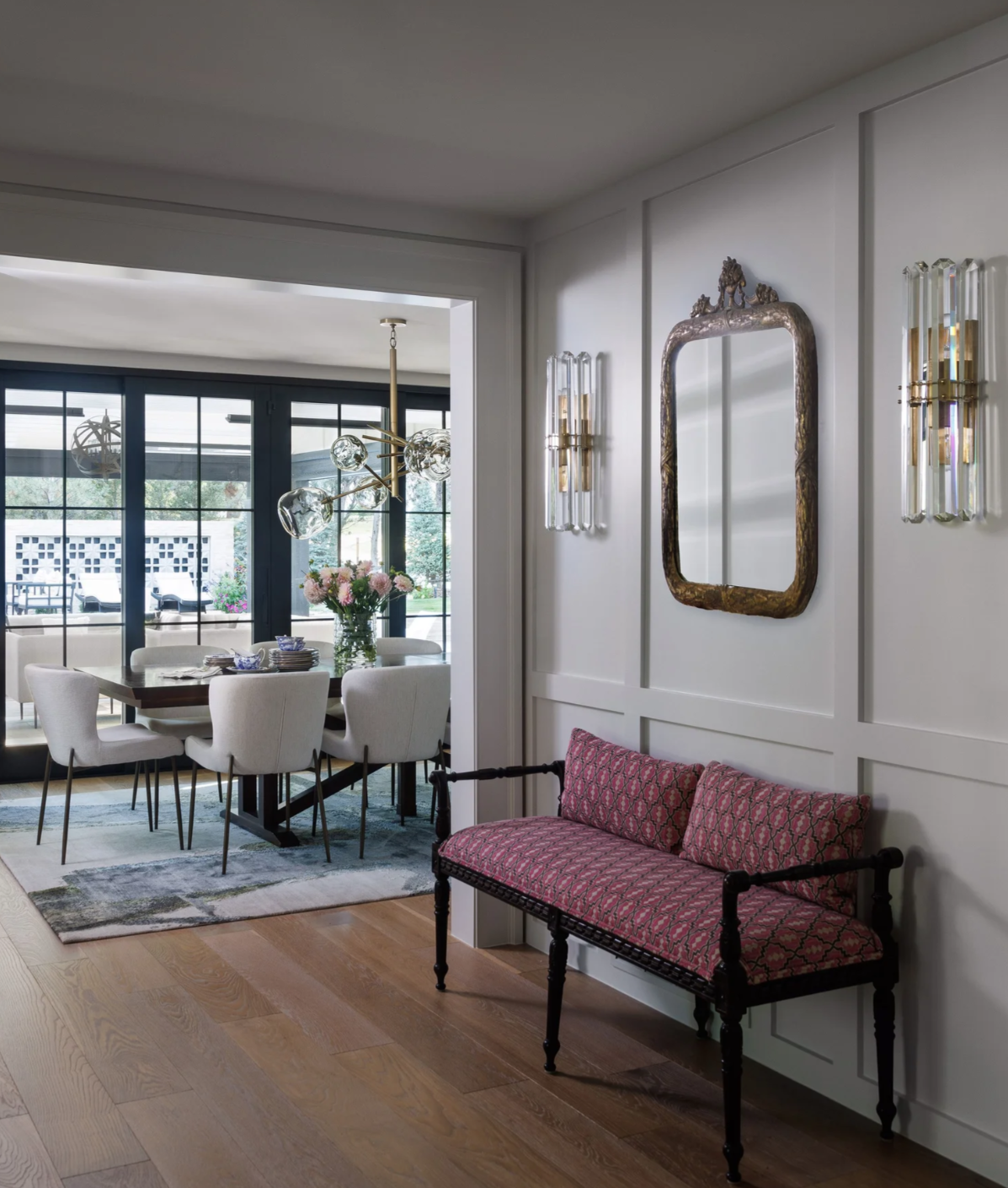 This transitional home is a fresh take on the modern farmhouse. Classic detailing throughout keeps the home timeless, while modern glam undertones add texture throughout. A unique hidden storage wall in the dining room features wall paneling from DuChateau. All cabinetry is through Coeur.